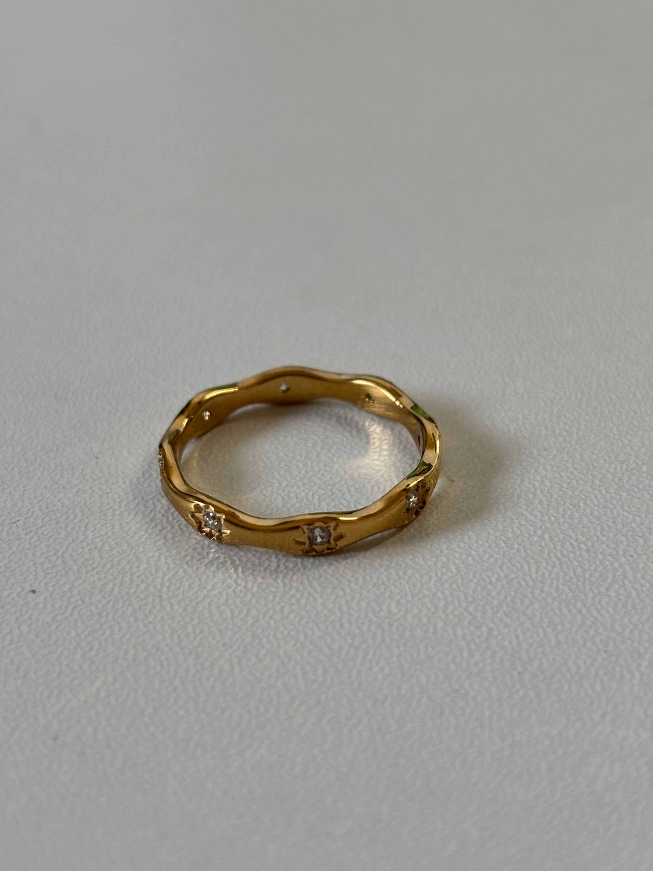 Meet the Celestial Ring, where elegance meets modern edge. Designed with a wavy silhouette and sparkling star-set stones, this ring captures the magic of the night sky while offering a durable, everyday luxury feel. Crafted from premium stainless steel and finished with 18K gold plating, it’s made to last while adding a celestial touch to your stack.